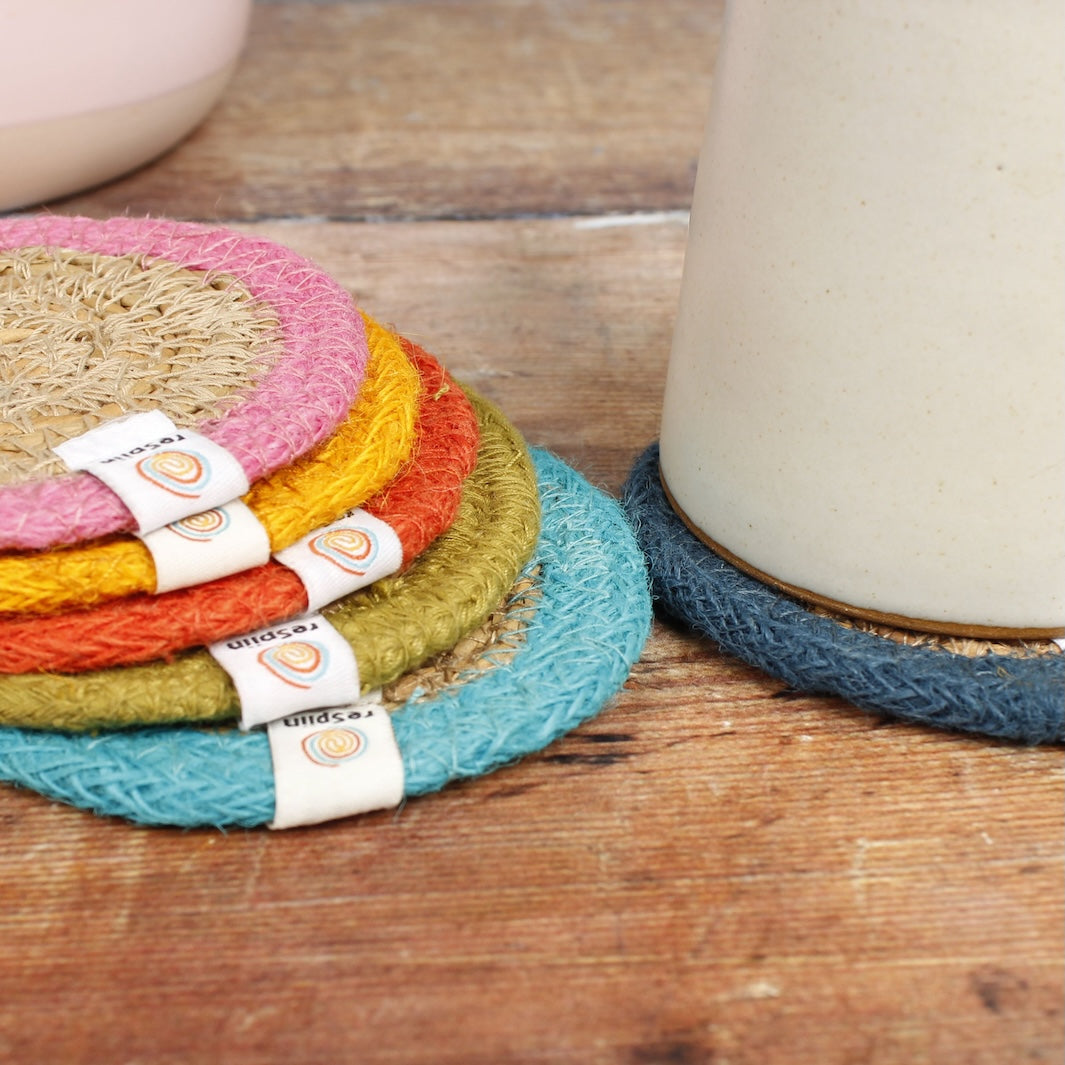 A set of six stylish, handcrafted coasters in a rainbow of beautiful colours. Made from natural seagrass and jute, they bring a sustainable splash of colour to any home!