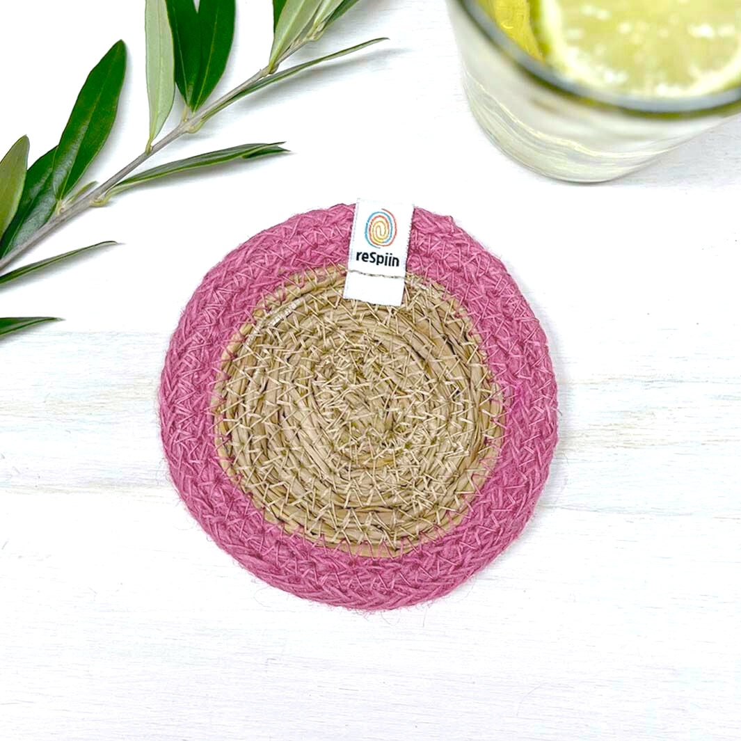 Set of 6 Seagrass & Jute Coasters - Natural/Bright Pink